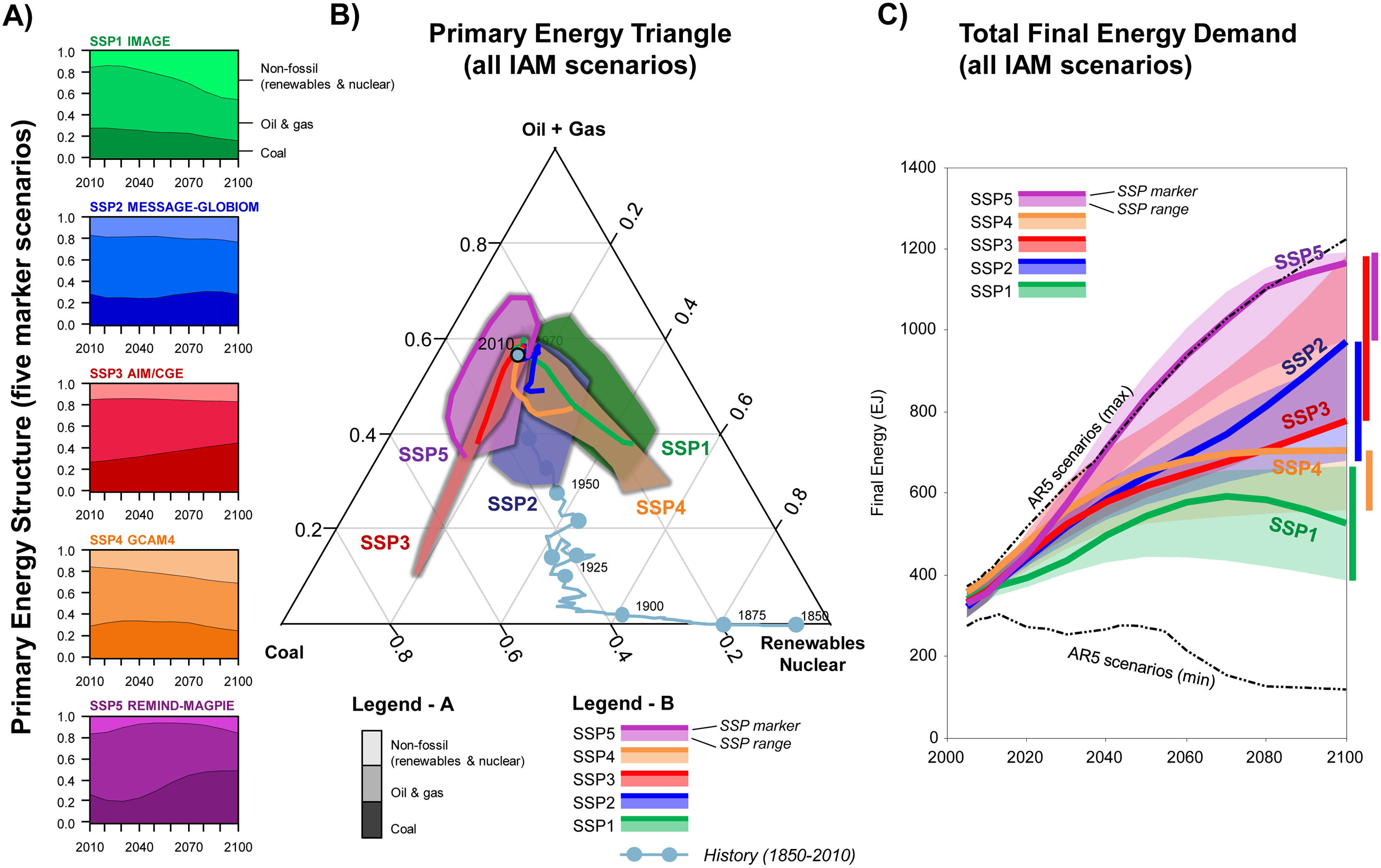 This paper and dataset presents the overview of the Shared Socioeconomic Pathways (SSPs) and their energy, land use, and emissions implications. The SSPs are part of a new scenario framework, established by the climate change research community in order to facilitate the integrated analysis of future climate impacts, vulnerabilities, adaptation, and mitigation. The pathways were developed over the last years as a joint community effort and describe plausible major global developments that together would lead in the future to different challenges for mitigation and adaptation to climate change. The SSPs are based on five narratives describing alternative socio-economic developments, including sustainable development, regional rivalry, inequality, fossil-fueled development, and middle-of-the-road development. The long-term demographic and economic projections of the SSPs depict a wide uncertainty range consistent with the scenario literature. A multi-model approach was used for the elaboration of the energy, land-use and the emissions trajectories of SSP-based scenarios. The baseline scenarios lead to global energy consumption of 400–1200 EJ in 2100, and feature vastly different land-use dynamics, ranging from a possible reduction in cropland area up to a massive expansion by more than 700 million hectares by 2100. The associated annual CO2 emissions of the baseline scenarios range from about 25 GtCO2 to more than 120 GtCO2 per year by 2100. With respect to mitigation, we find that associated costs strongly depend on three factors: (1) the policy assumptions, (2) the socio-economic narrative, and (3) the stringency of the target. The carbon price for reaching the target of 2.6 W/m2 that is consistent with a temperature change limit of 2 °C, differs in our analysis thus by about a factor of three across the SSP marker scenarios. Moreover, many models could not reach this target from the SSPs with high mitigation challenges. While the SSPs were designed to represent different mitigation and adaptation challenges, the resulting narratives and quantifications span a wide range of different futures broadly representative of the current literature. This allows their subsequent use and development in new assessments and research projects. Critical next steps for the community scenario process will, among others, involve regional and sectoral extensions, further elaboration of the adaptation and impacts dimension, as well as employing the SSP scenarios with the new generation of earth system models as part of the 6th climate model intercomparison project (CMIP6). Recommended article. The Shared Socioeconomic Pathways and their energy, land use, and greenhouse gas emissions implications: An overview, Global Environmental Change, Volume 42, Pages 153-168, 2017, ISSN 0959-3780, DOI:110.1016/j.gloenvcha.2016.05.009.