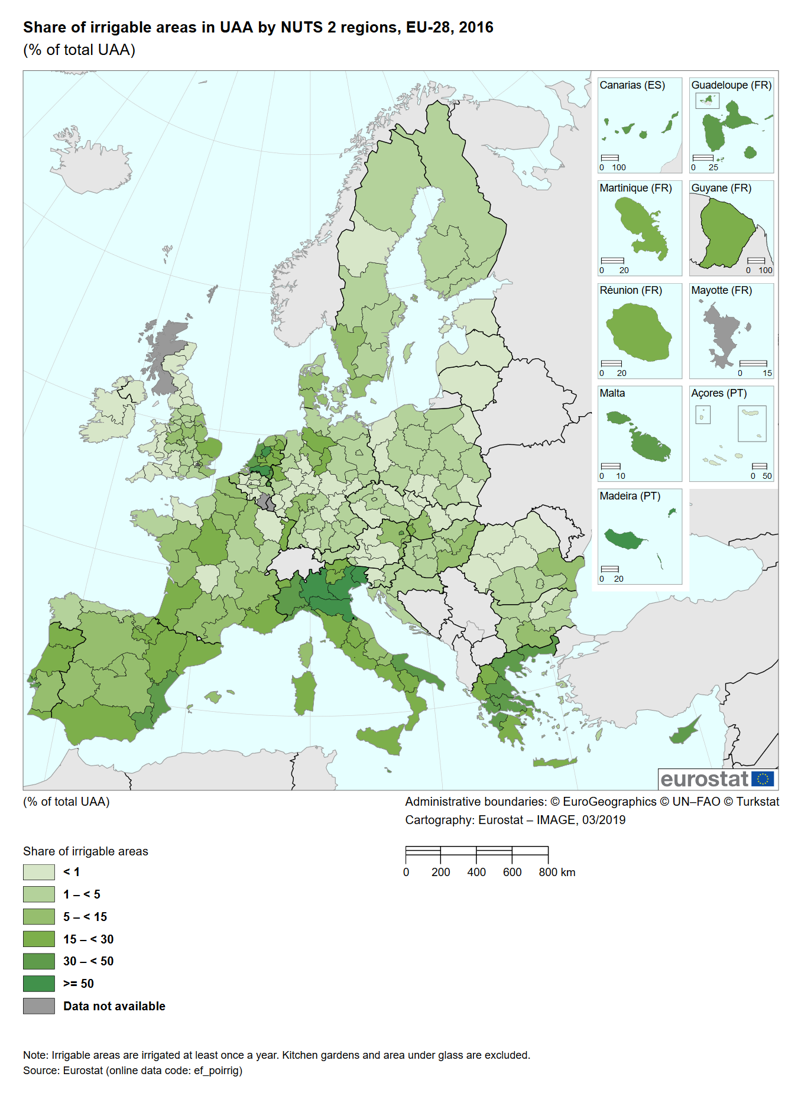 The indicator assesses the trend of the irrigable and irrigated areas and their share of the total utilised agricultural area (UAA). The irrigable area is the area which is equipped for irrigation. This area does not show so much variation from year to year as it is costly for the farmer to invest in irrigation equipment. The irrigated area measures the actual amount of land irrigated and can vary significantly from year to year due to, for instance, meteorological conditions or the choice of crop.